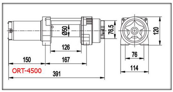 - Электромотор мощностью 1,8 л.с., работающий от бортовой сети 12V в паре с редуктором, имеющим 3-ступенчатый планетарный механизм с передаточным отношением 198:1, обеспечивают лебедке тяговое усилие в 2041 кг.